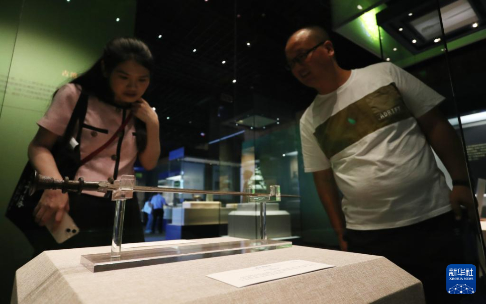 7月10日,参观者在越王鹿郢剑展柜前驻足观看。