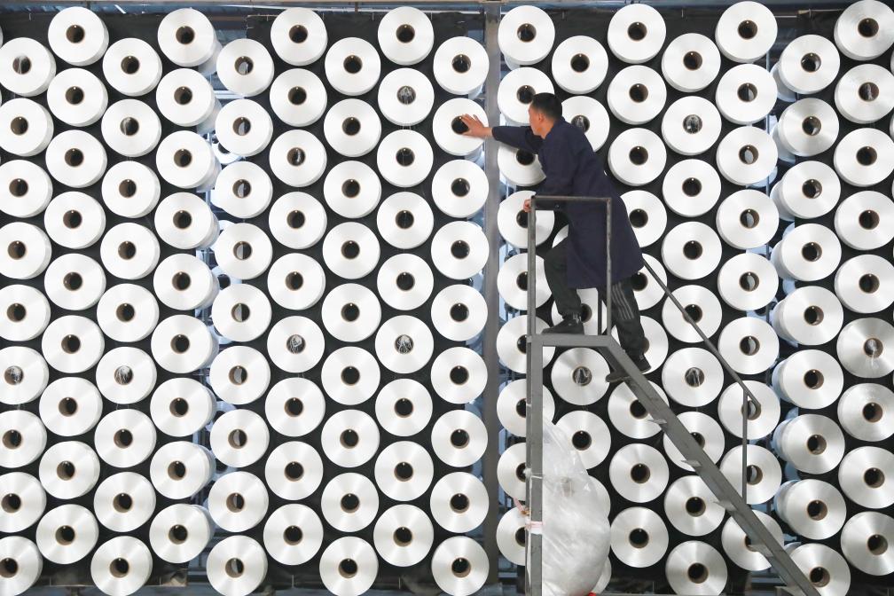 在浙江省杭州市临安区天目山镇一家纺织企业,工人在车间里忙碌(3月2日摄)。新华社发(胡剑欢 摄)