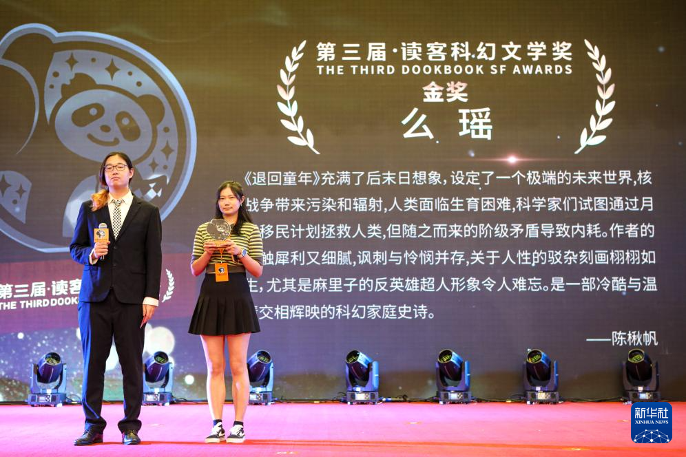 8月19日,第三届读客科幻文学奖金奖获得者么瑶(右)上台领奖。