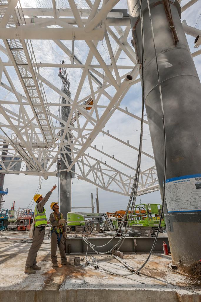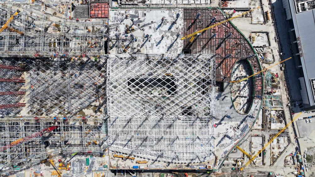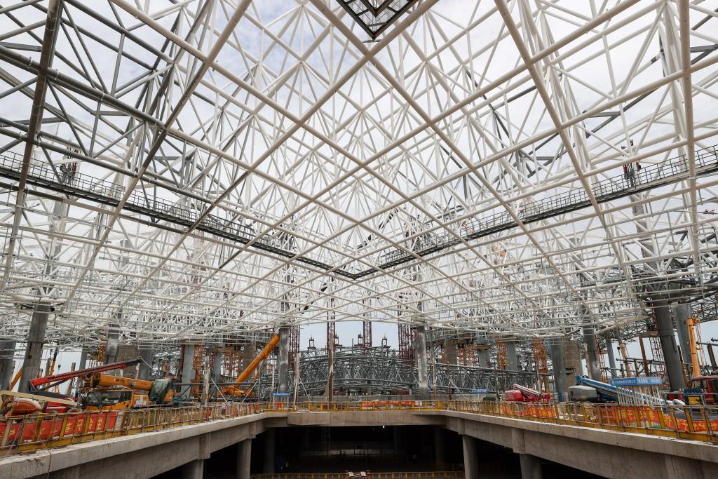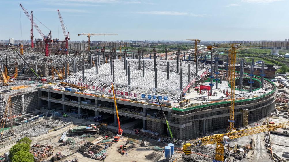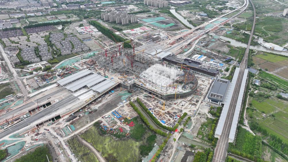 新华网上海4月26日电(记者王翔)4月25日,由铁四院牵头、中铁二十四局承建的沪苏湖铁路上海松江站服务中心屋面钢结构桁架提升到位,项目进入金属屋面施工阶段。