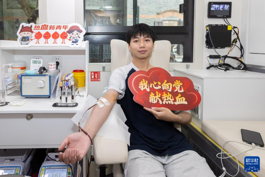 7月1日,一位从南京来上海旅游的大学生在红色主题献血车上献血。
