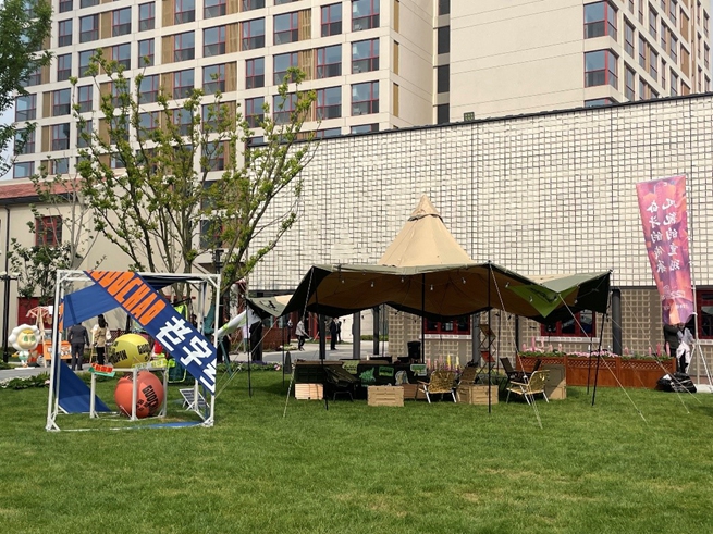 图为228街坊中央草坪上搭起的露营帐篷。新华网发(长白新村街道供图)