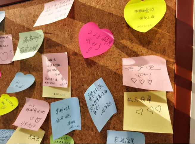 在一张贴纸上,参观者写下“杨浦新天地”。新华网发(王若宇摄)