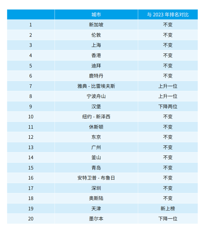 指数结果显示,2024年全球航运中心城市综合实力前20位分别为新加坡、伦敦、上海、香港、迪拜、鹿特丹、雅典-比雷埃夫斯、宁波舟山、汉堡、纽约-新泽西、休斯顿、东京、广州、釜山、青岛、安特卫普-布鲁日、深圳、奥斯陆、天津、墨尔本。