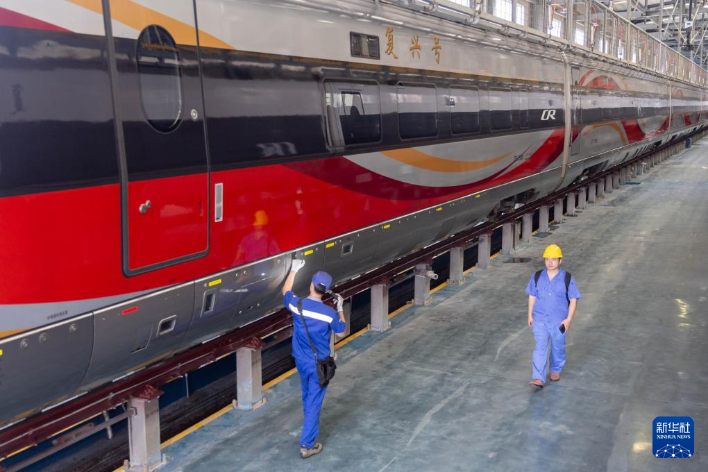 9月26日,工作人员在上海动车段虹桥动车所检修复兴号列车。