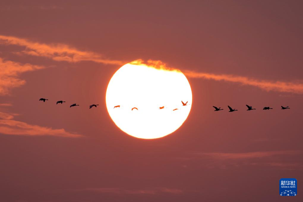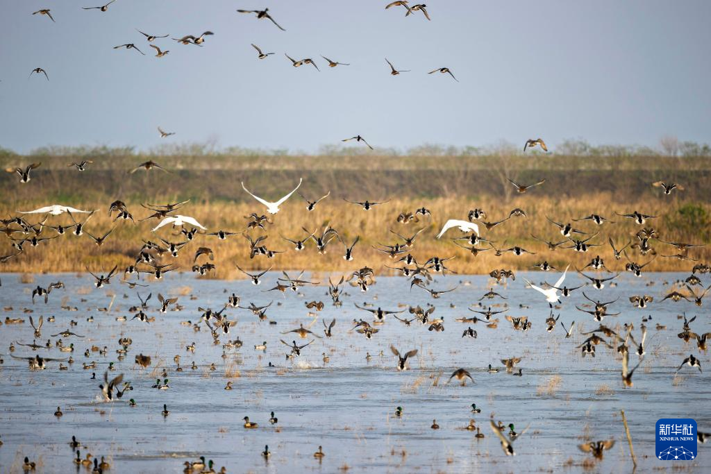 时值候鸟迁徙季,大批候鸟飞抵上海崇明东滩鸟类国家级自然保护区的湿地栖息,风景如画