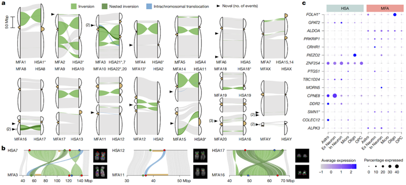 基因组的空间折叠如同精心设计的折纸艺术。染色体的倒位、易位等大尺度结构变异会重塑三维折叠模式,进而影响基因的“开关”状态。尽管这些变异被认为是物种演化的驱动力,但人类与猕猴等近亲灵长类间的复杂结构变异图谱及其功能影响,长期以来缺乏系统性证据。
