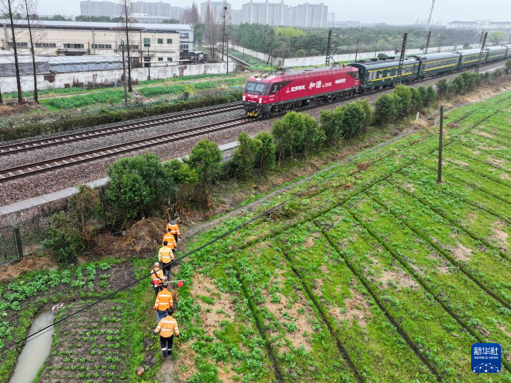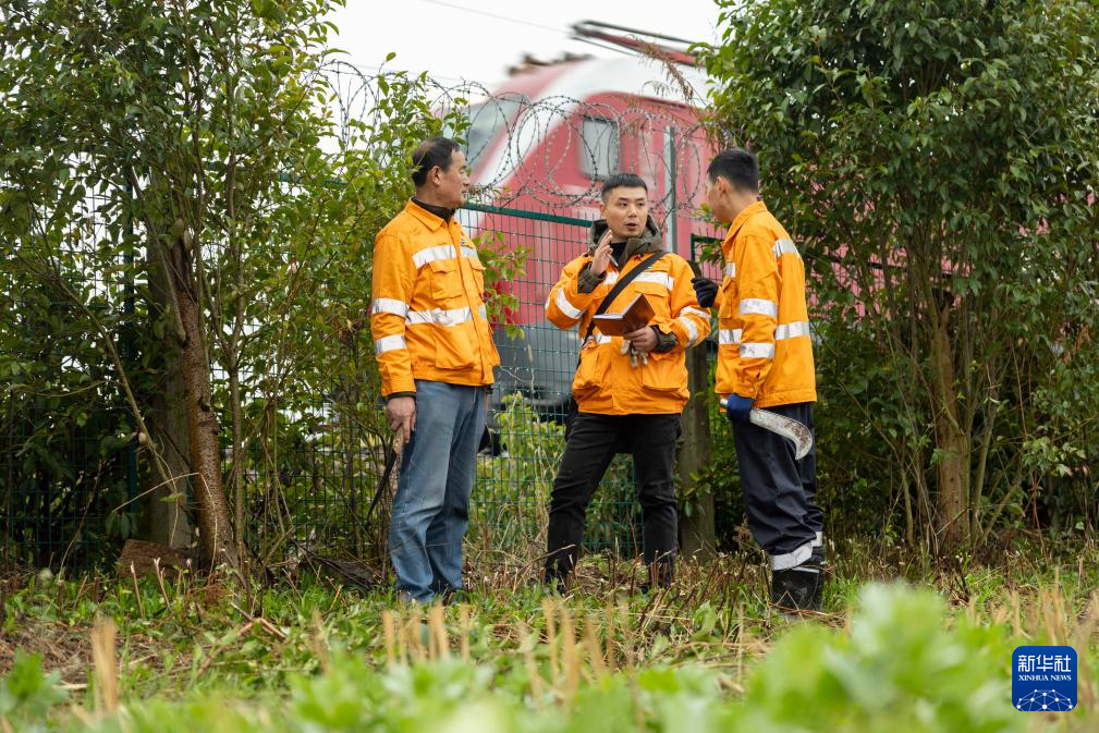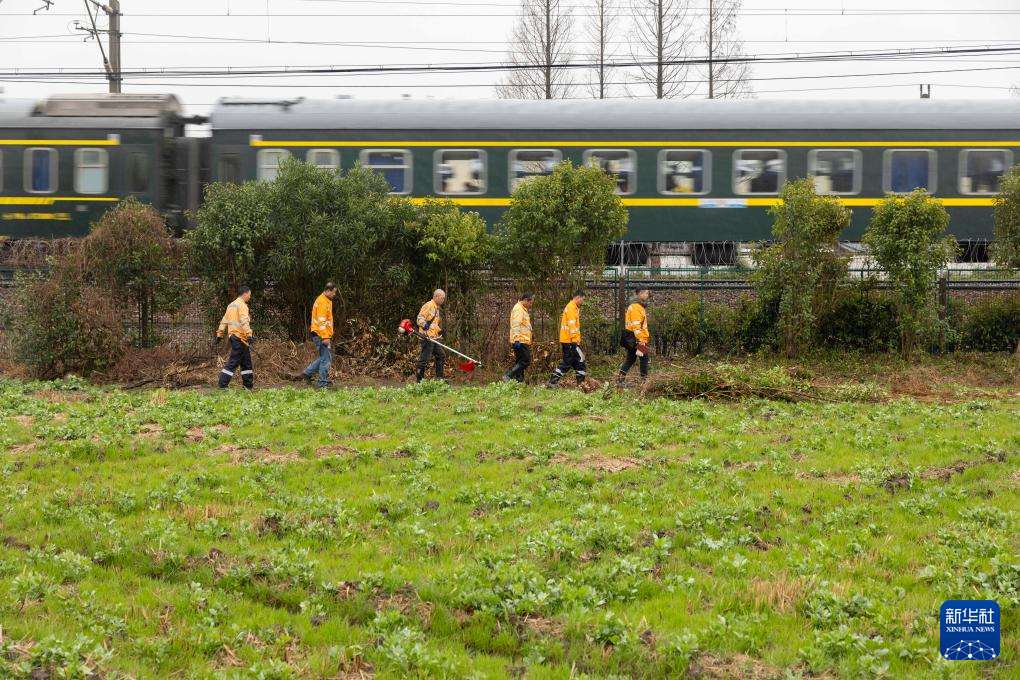 3月12日,上海工务段林务工区职工行走在铁路沿线绿化林带。