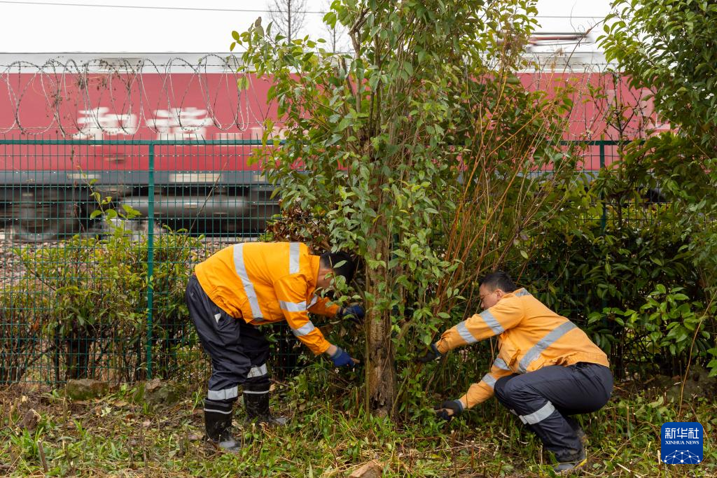 3月12日,上海工务段林务工区职工在铁路沿线绿化林带修枝。