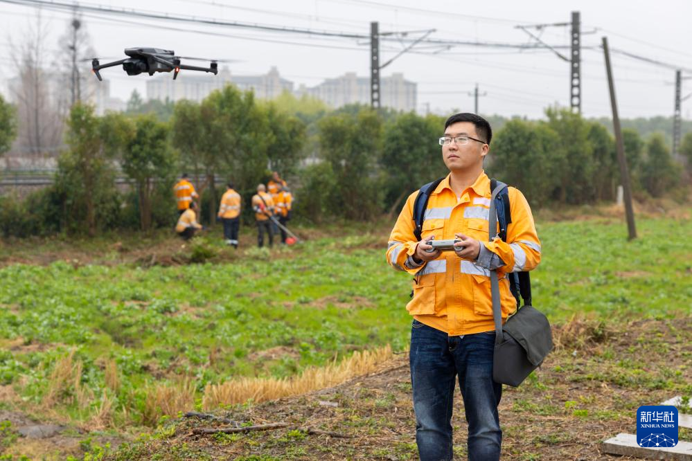 3月12日,年轻职工李昶操作无人机对铁路沿线的树木和植被进行高空巡查。