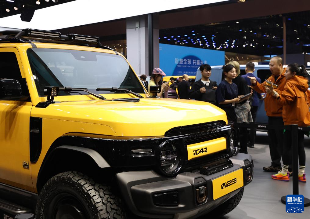 4月23日,参观者在一辆icarV23汽车前交流讨论。