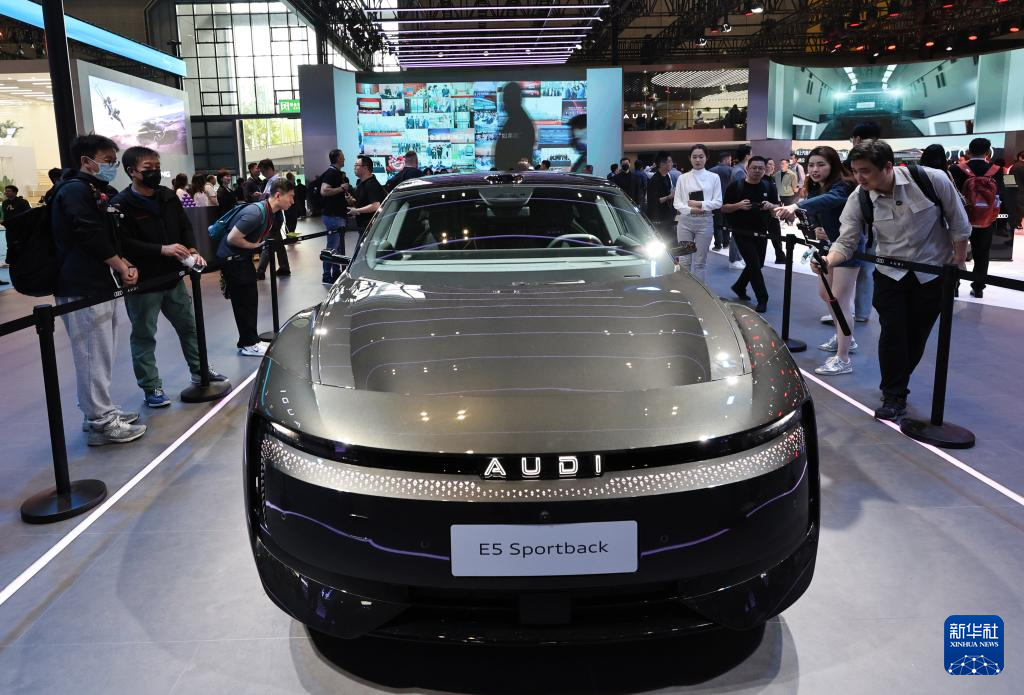 4月23日,参观者在“AUDI”品牌E5纯电汽车旁驻足观看。