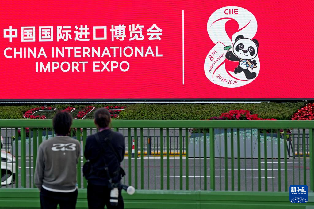 10月29日拍摄的国家会展中心(上海)周边的进博会标志。