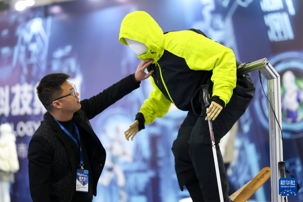 12月26日,工作人员整理展示服装的智能模特架。