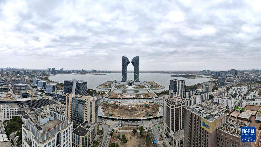 1月29日拍摄的位于滴水湖畔的临港西岛中银金融中心双子塔楼(无人机全景照片)。