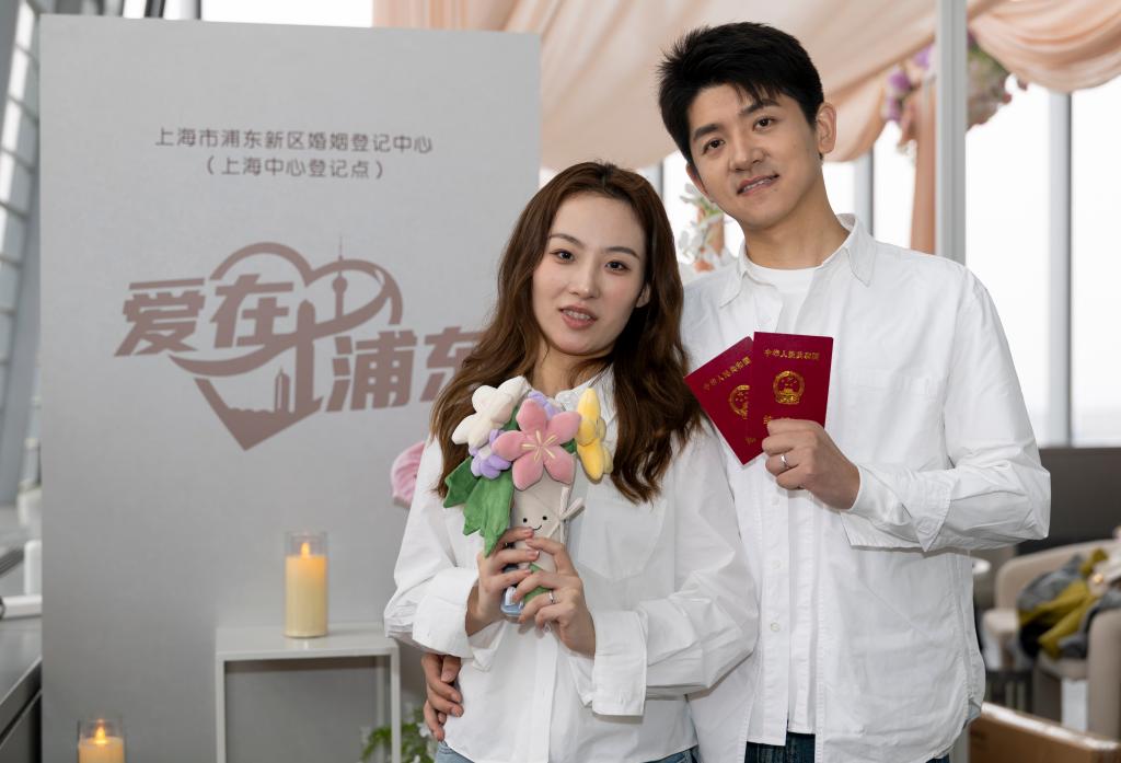 3月3日,一对新人在上海市浦东新区婚姻登记中心(上海中心登记点)合影。